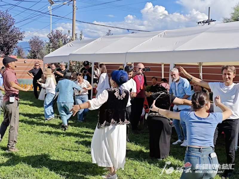 土耳其媒體人士在新源縣那拉提鎮(zhèn)英加爾村與村民同跳新疆舞。石榴云/新疆日報(bào)記者 宋海波攝