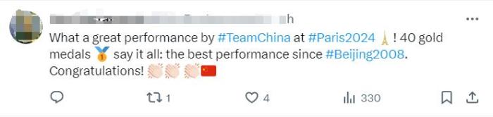 “中國(guó)隊(duì)在2024巴黎奧運(yùn)會(huì)上的表現(xiàn)太棒了!40枚金牌收官,這是自2008年北京奧運(yùn)會(huì)以來(lái)中國(guó)隊(duì)的最佳表現(xiàn)。恭喜!”