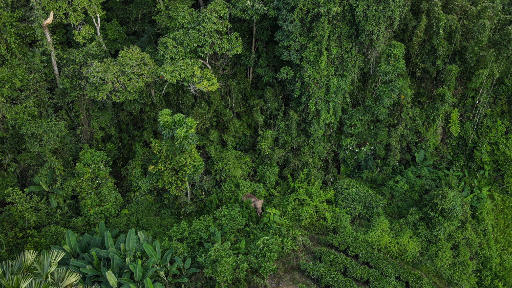 在云南西雙版納國家級自然保護(hù)區(qū)勐養(yǎng)片區(qū)邊緣活動的亞洲象阿寶(7月26日無人機(jī)照片)。(許團(tuán)明 攝)