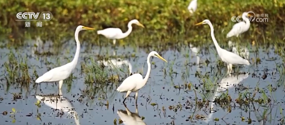 在河南周口市淮陽區(qū),由于近期降雨頻繁,當(dāng)?shù)毓胚\(yùn)河不少低洼地帶變成灘涂濕地,多群白鷺匯聚于此,棲息覓食。