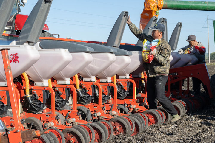 農(nóng)民在黑龍江省集賢縣一片耕地里向播種機(jī)中添加大豆種子(2024年5月9日攝)。新華社記者 謝劍飛 攝
