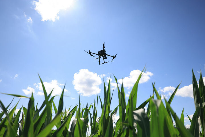 在黑龍江北大荒集團(tuán)趙光農(nóng)場有限公司農(nóng)業(yè)科技園區(qū),一臺(tái)智能無人機(jī)按照規(guī)定時(shí)間、規(guī)定路線進(jìn)行自動(dòng)巡田作業(yè)(2024年7月22日攝)。新華社發(fā)(錢泊羽攝)