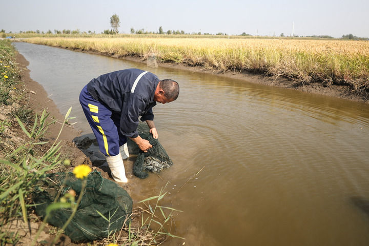 工作人員在遼寧盤錦市大洼區(qū)三角洲“蟹稻+”綜合種養(yǎng)模式試驗(yàn)基地的稻田收獲河蟹(2022年9月28日攝)。新華社記者 潘昱龍 攝