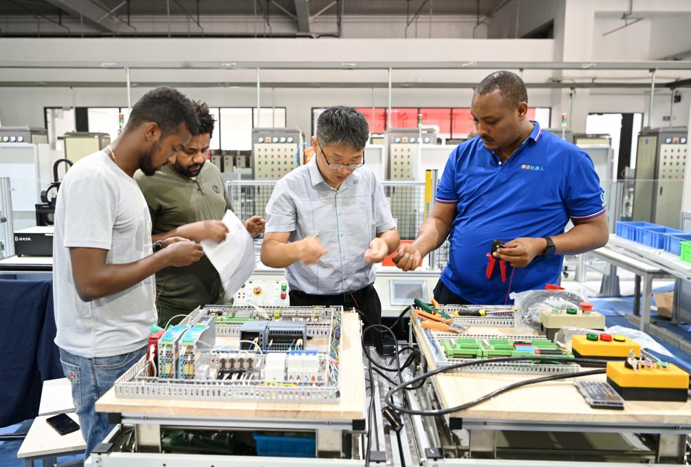 在天津職業(yè)技術(shù)師范大學(xué),老師帶領(lǐng)韓士蘭(右一)和其他留學(xué)生進(jìn)行實(shí)訓(xùn)操作(2022年7月29日攝)。韓士蘭來(lái)自埃塞俄比亞,在天津?qū)W習(xí)期間,韓士蘭積極利用學(xué)校先進(jìn)的職業(yè)教育實(shí)踐條件,專(zhuān)注于人工智能制造和工業(yè)機(jī)器人方向的研究。新華社記者李然 攝