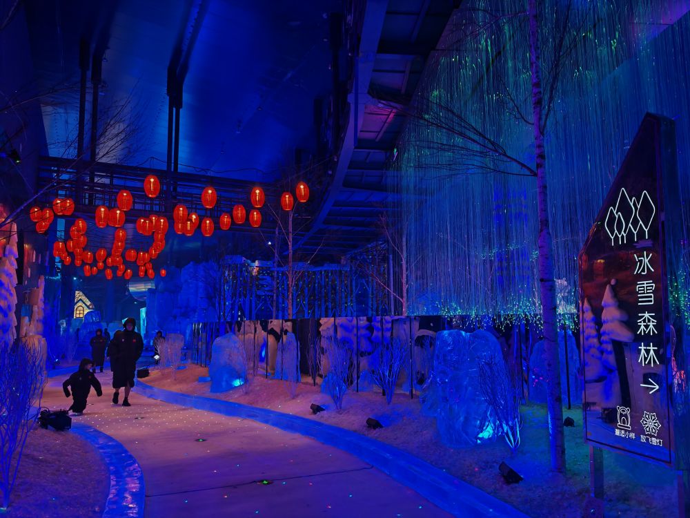 暑假還沒結(jié)束,游人卻穿著羽絨服,在哈爾濱冰雪大世界夢幻冰雪館里游玩。