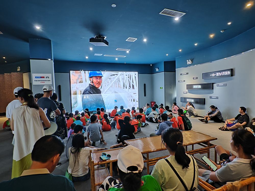 8月14日,來(lái)自河南鄭州研學(xué)團(tuán)隊(duì)的中小學(xué)生在南仁東事跡館觀看影片。新華社記者 齊健 攝