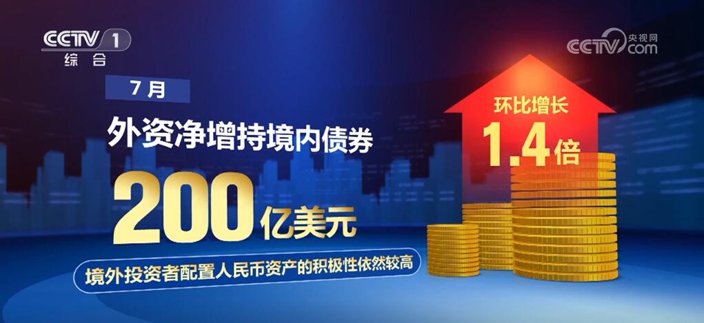 國家外匯管理局?jǐn)?shù)據(jù)顯示,7月,外資凈增持境內(nèi)債券200億美元,環(huán)比增長(zhǎng)1.4倍。境外投資者配置人民幣資產(chǎn)的積極性依然較高。