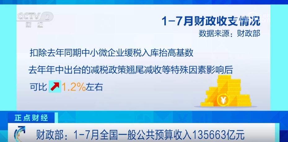 數(shù)據(jù)顯示,1—7月,全國一般公共預(yù)算收入135663億元,同比下降2.6%,扣除去年同期中小微企業(yè)緩稅入庫抬高基數(shù)、去年年中出臺(tái)的減稅政策翹尾減收等特殊因素影響后,可比增長1.2%左右。