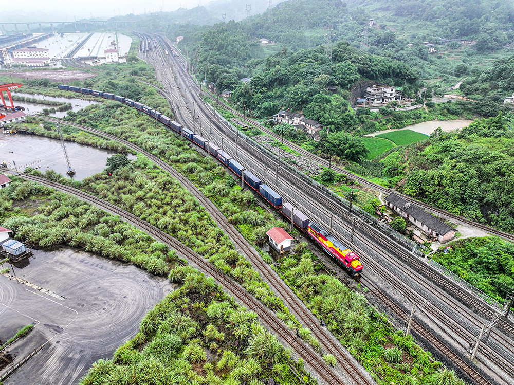 2024年6月27日,西部陸海新通道中老泰馬跨境鐵路班列在重慶江津小南埡站發(fā)車(無人機照片)。新華社記者唐奕攝