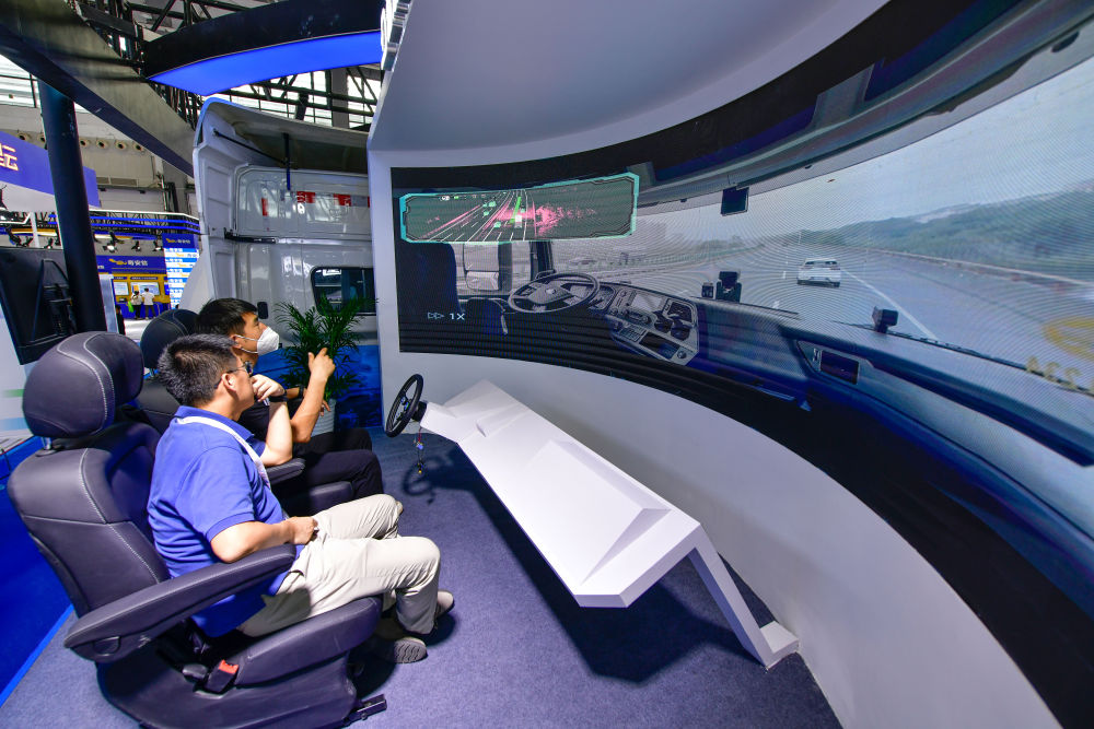 8月28日,觀展者在2024中國(guó)國(guó)際大數(shù)據(jù)產(chǎn)業(yè)博覽會(huì)現(xiàn)場(chǎng)參觀智能自動(dòng)駕駛系統(tǒng)。