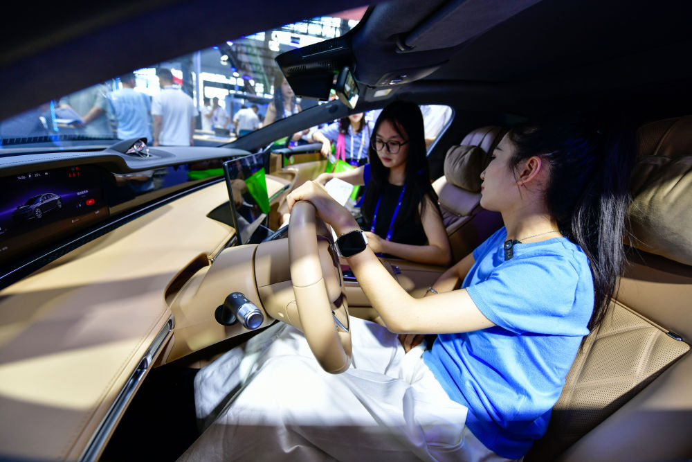 8月28日,參會(huì)人員在數(shù)博會(huì)上體驗(yàn)新能源智能駕駛汽車(chē)。