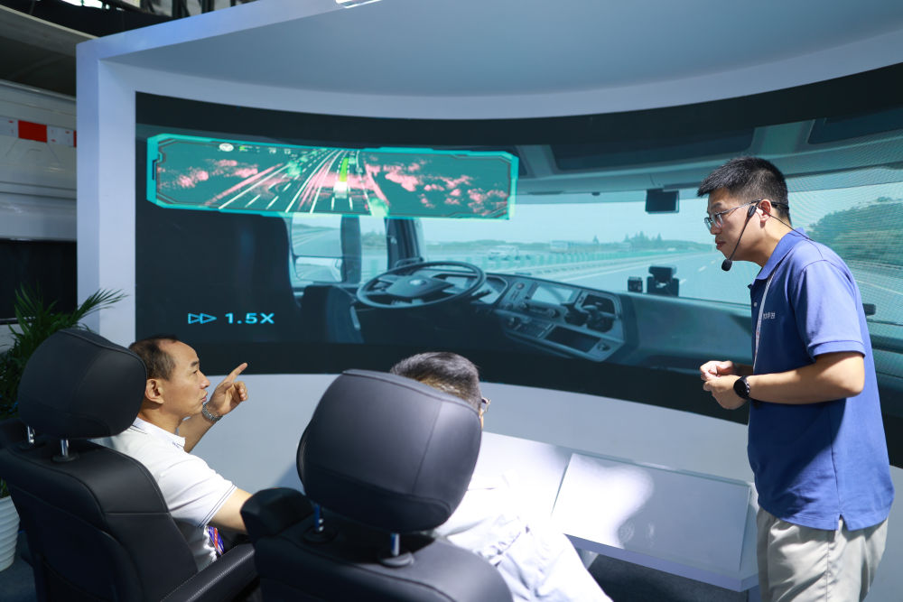 8月28日,工作人員在數(shù)博會(huì)上播放無(wú)人駕駛重型卡車(chē)上路行駛視頻。