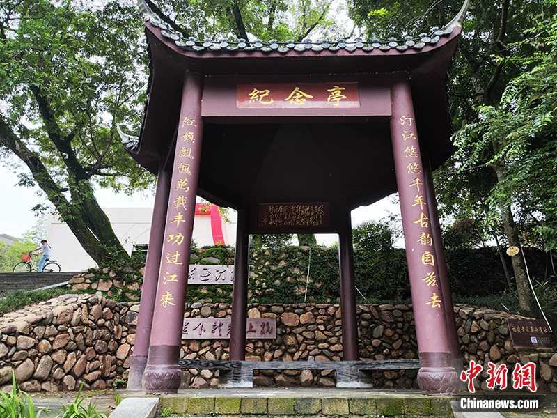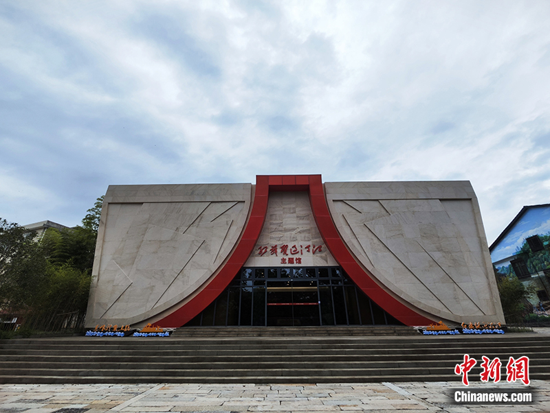 在當(dāng)年擺渡人們行舟悠游來去的渡口旁,一棟造型奇特的建筑映入采訪團的眼簾——展館整體結(jié)構(gòu)形如“四”字,寓意“紅四軍”,中間紅色砌磚組成“八一”字樣,九面旗幟浮雕象征九條船載著紅軍渡江。