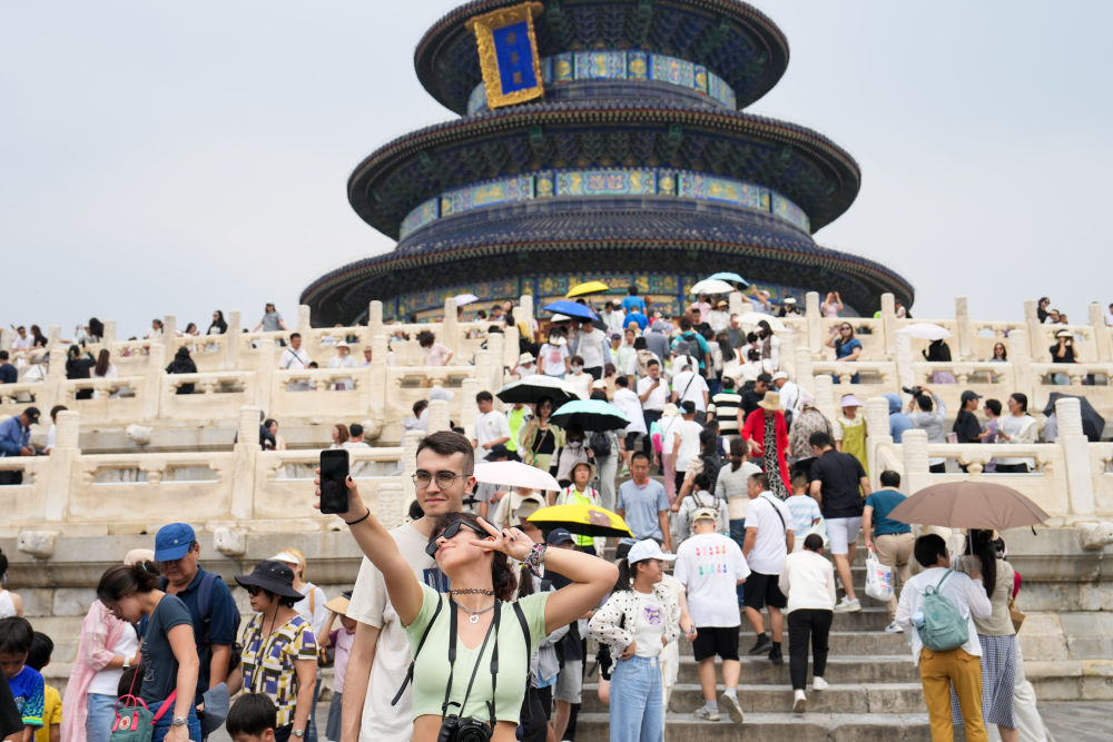 7月9日,兩名外國(guó)游客在北京天壇公園祈年殿前自拍合影。新華社記者 鞠煥宗 攝