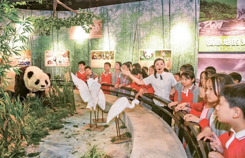 新時(shí)代以來(lái),教育系統(tǒng)著力推動(dòng)思想政治教育、專業(yè)教育與創(chuàng)新教育、社會(huì)實(shí)踐、志愿服務(wù)等的融合。圖為2024年5月17日,學(xué)生們?cè)诮饕素S熊貓科技館開(kāi)展“行走的思政課”主題科普教育活動(dòng),增強(qiáng)節(jié)約資源和保護(hù)自然環(huán)境意識(shí)。 人民圖片 周亮/攝