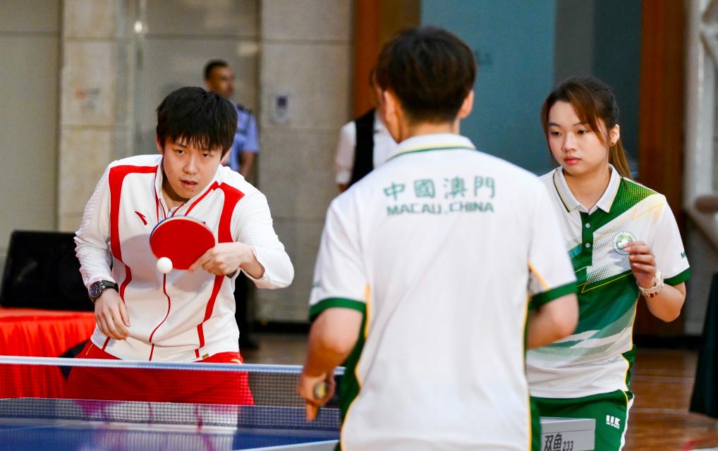 9月1日,乒乓球運(yùn)動員王楚欽(左)與澳門運(yùn)動員切磋球技。新華社記者 郭雨祺 攝
