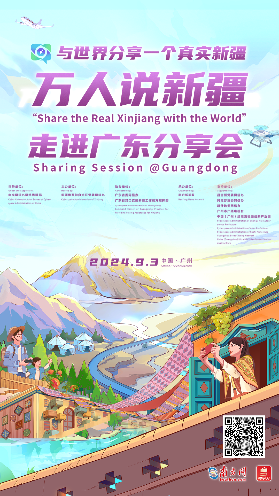 本次分享會(huì)將圍繞“讀懂新疆”“新粵同心”“共繪‘疆’來”三個(gè)篇章開展圓桌對話和視頻連線。國內(nèi)知名學(xué)者將從歷史文化、經(jīng)濟(jì)發(fā)展、民族特色、風(fēng)土人情等不同角度進(jìn)行深層次的分享解讀,展示新疆的多元文化和人文情懷,把新疆溫柔地說與全世界。新粵合作親身參與人士,將講述新粵兩地從“單向援建”到“相互賦能”,攜手共進(jìn)的故事。粵港澳大灣區(qū)青年、海內(nèi)外博主等“跨界”人士將暢談新疆未來發(fā)展,共話美好“疆”來。