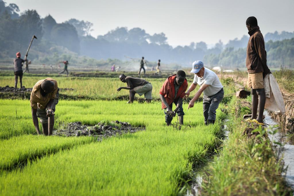 2024年8月14日,在盧旺達南方省胡耶區(qū),水稻專家鄭瑞金(右二)在稻田里指導(dǎo)當?shù)氐巨r(nóng)進行秧苗移栽。新華社記者 韓旭 攝