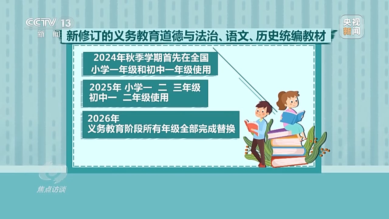 今年秋季學(xué)期,修訂后的教材在小學(xué)一年級(jí)和初中一年級(jí)投入使用;2025年,小學(xué)一、二、三年級(jí)和初中一、二年級(jí)使用;2026年,義務(wù)教育階段所有年級(jí)全部完成替換。