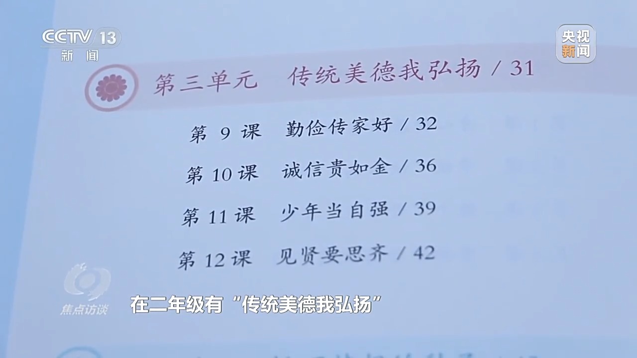 義務(wù)教育道德與法治統(tǒng)編教材編委會(huì)主任 孫蚌珠:為了讓學(xué)生循序漸進(jìn)地了解中華優(yōu)秀傳統(tǒng)文化,堅(jiān)定文化自信,在二年級(jí)有“傳統(tǒng)美德我弘揚(yáng)”,四年級(jí)有“博大精深的中華優(yōu)秀傳統(tǒng)文化”,七年級(jí)有“傳承中華優(yōu)秀傳統(tǒng)文化”,這樣層層遞進(jìn)。