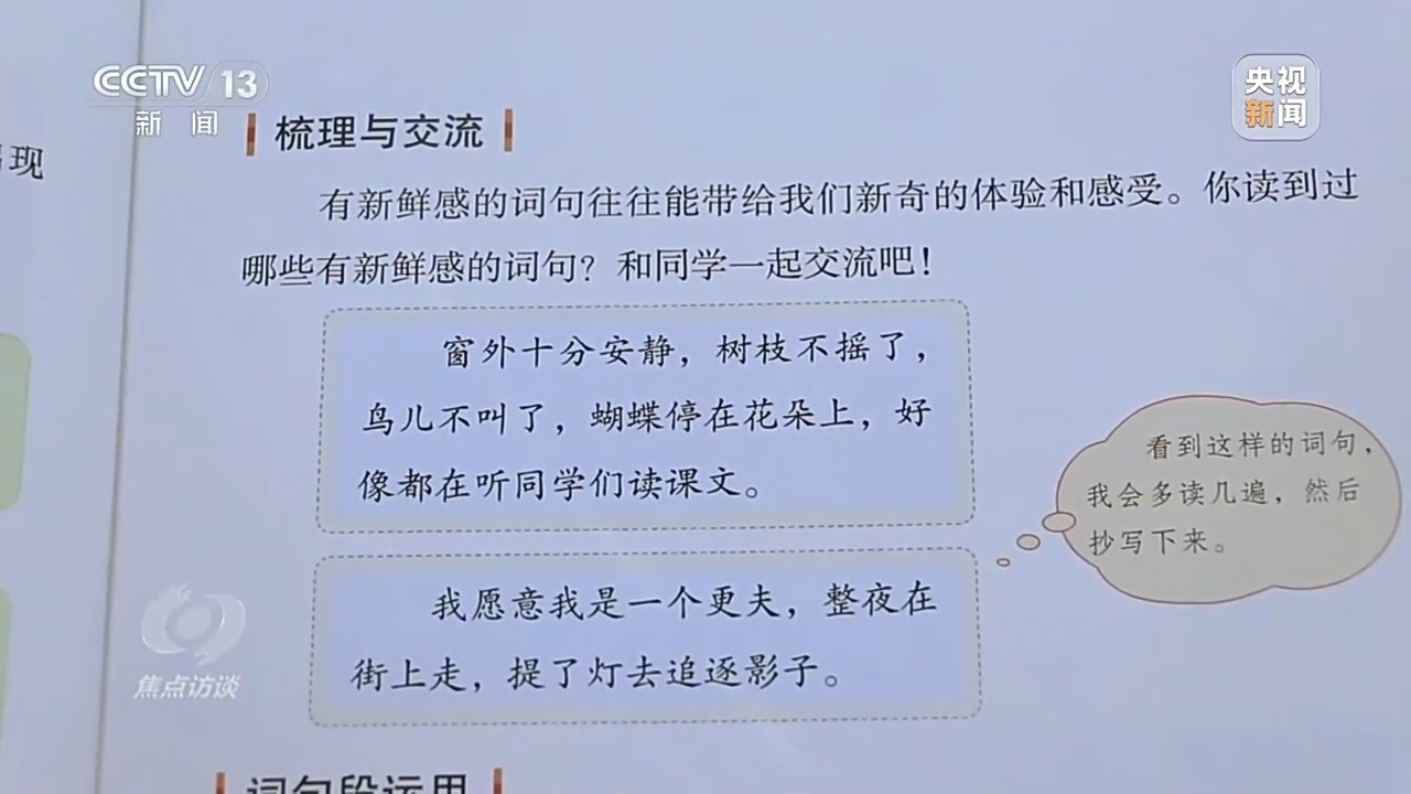 為了更好地檢驗(yàn)教材的適宜性,2023年下半年,教育部在全國(guó)范圍內(nèi)組織550多所學(xué)校、2000多名教師、10萬(wàn)多名學(xué)生開展試教試用,組織500名中小學(xué)骨干教師和教研員進(jìn)行精細(xì)審讀。北京芳草地國(guó)際學(xué)校的語(yǔ)文教師試教了六年級(jí)下冊(cè)的第一單元。
