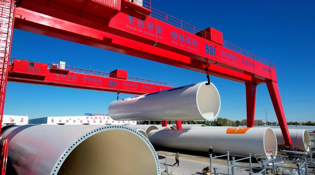 蒙東(通遼)風(fēng)電裝備制造產(chǎn)業(yè)基地內(nèi),一排排風(fēng)葉和塔筒即將運往全國各地。林林攝