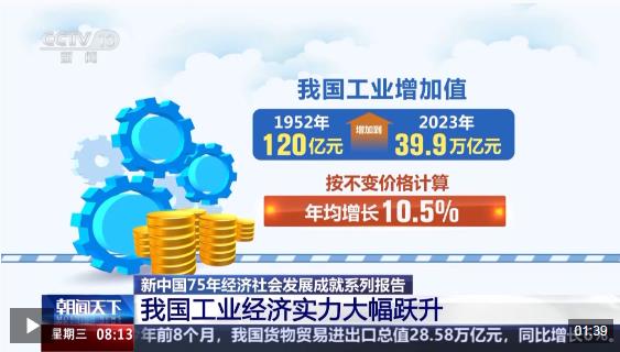 國家統(tǒng)計局昨天(10日)發(fā)布的新中國75年經(jīng)濟社會發(fā)展成就系列報告顯示,新中國成立75年以來,我國工業(yè)經(jīng)濟實現(xiàn)了規(guī)??偭康目缭绞皆鲩L和發(fā)展質(zhì)量的顯著提升,由農(nóng)業(yè)國成長為世界第一制造業(yè)大國。