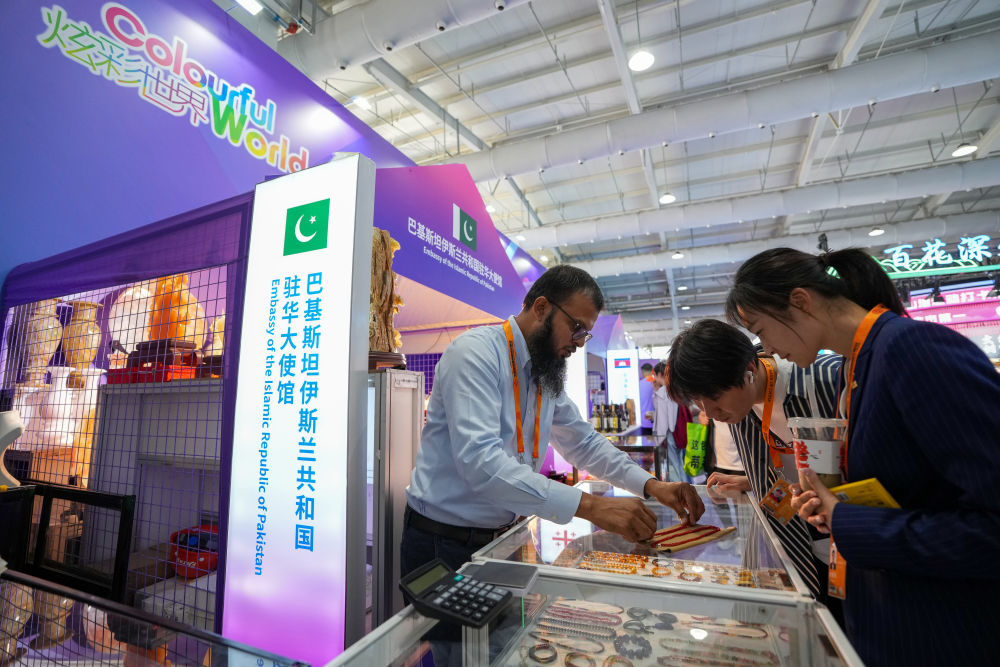 9月12日,在服貿(mào)會(huì)首鋼園區(qū)的炫彩世界——‘一帶一路’沿線國(guó)家特色文化展示活動(dòng)上,參觀者在巴基斯坦伊斯蘭共和國(guó)駐華大使館展區(qū)選購(gòu)商品。新華社記者 鞠煥宗 攝
