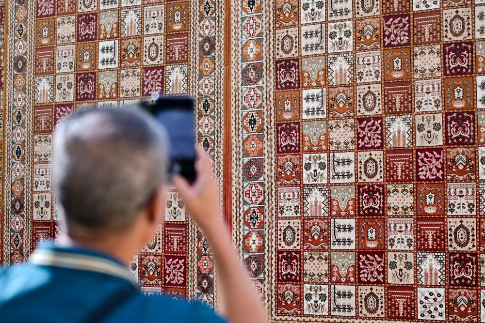 步入龜茲小巷,一幅巨大的地毯墻首先映入眼簾,地毯上大大小小的方格整齊排列,圖案精美對(duì)稱、色彩艷麗。地毯是新疆少數(shù)民族家庭中最常見的裝飾品,一般以羊毛剪裁編織而成,集繪畫、雕刻、編織、刺繡、印染等手工技藝于一體,是展現(xiàn)新疆民族風(fēng)情的典型物品之一。