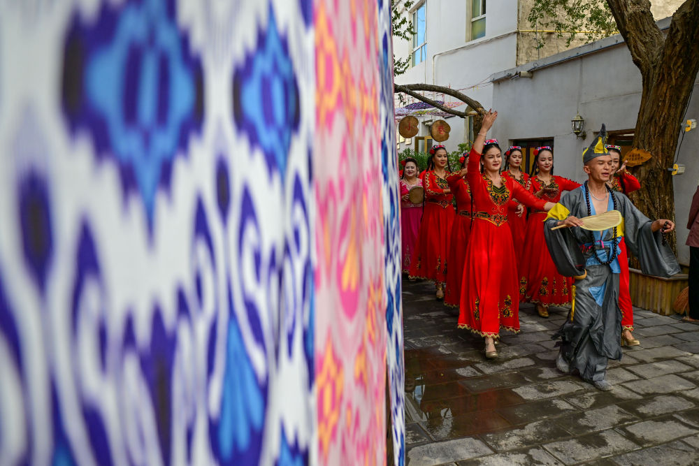 在新疆庫車市龜茲小巷,樂舞表演團(tuán)隊(duì)在小巷巡演。新華社記者 丁磊 攝