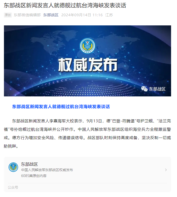 東部戰(zhàn)區(qū)新聞發(fā)言人李熹海軍大校表示,9月13日,德“巴登-符騰堡”號(hào)護(hù)衛(wèi)艦、“法蘭克福”號(hào)補(bǔ)給艦過(guò)航臺(tái)灣海峽并公開(kāi)炒作。中國(guó)人民解放軍東部戰(zhàn)區(qū)組織海空兵力全程跟監(jiān)警戒。德方行為增加安全風(fēng)險(xiǎn)、傳遞錯(cuò)誤信號(hào)。戰(zhàn)區(qū)部隊(duì)時(shí)刻保持高度戒備,堅(jiān)決反制一切威脅挑釁。