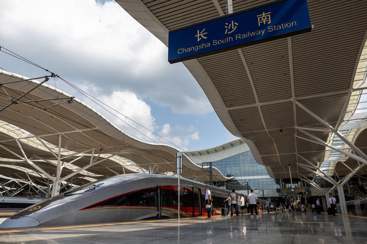 2024年6月15日,武漢至深圳北的G875次列車經(jīng)停長沙南站。當(dāng)日,京廣高鐵武廣段復(fù)興號動車組列車按時速350公里高標(biāo)運營,標(biāo)志著京廣高鐵武漢至廣州段安全標(biāo)準(zhǔn)示范線全面建成,京廣高鐵全線實現(xiàn)復(fù)興號動車組列車按時速350公里高標(biāo)運營。新華社記者 伍志尊 攝