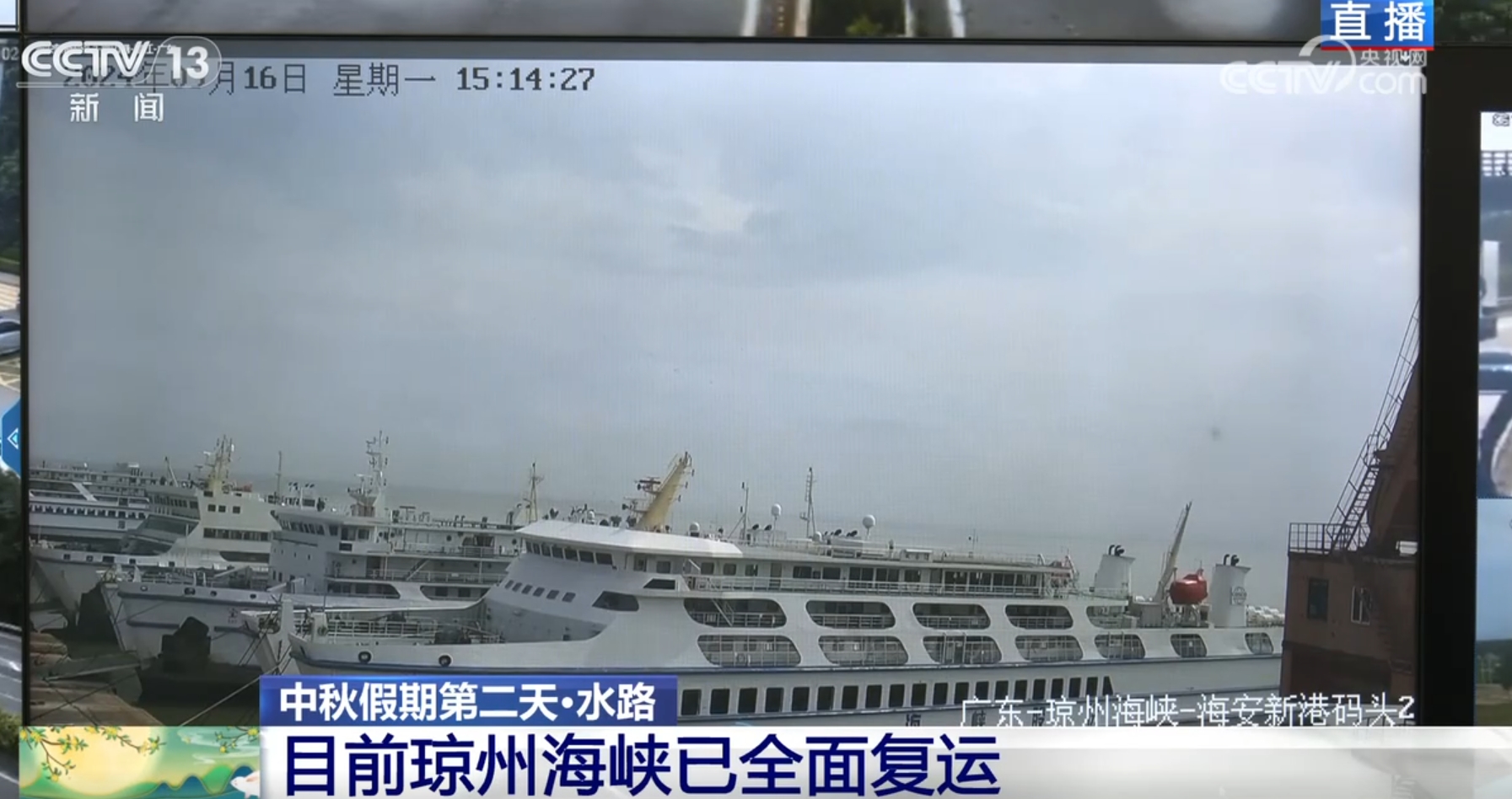 接下來(lái)看到的是瓊州海峽??谛潞8劭蜐L運(yùn)輸裝載現(xiàn)場(chǎng)的畫(huà)面,目前車(chē)輛和人員正在有序排隊(duì)上船。臺(tái)風(fēng)“摩羯”過(guò)后,在海事、客滾運(yùn)輸企業(yè)等多方共同努力下,目前瓊州海峽客滾運(yùn)輸航線已全面復(fù)運(yùn),運(yùn)力充足。海南海事部門(mén)已開(kāi)啟客滾船專(zhuān)項(xiàng)安檢活動(dòng),并且強(qiáng)化船舶現(xiàn)場(chǎng)監(jiān)督檢查,防范船舶“帶病”營(yíng)運(yùn),全力保障中秋假期重點(diǎn)時(shí)段瓊州海峽水上安全形勢(shì)平穩(wěn)。