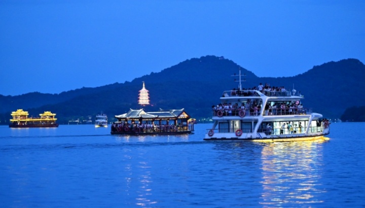 傍晚時分,游客們乘船夜游西湖