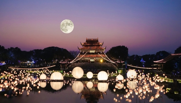 江蘇蘇州,水面圓形花燈與天上滿月相映成趣