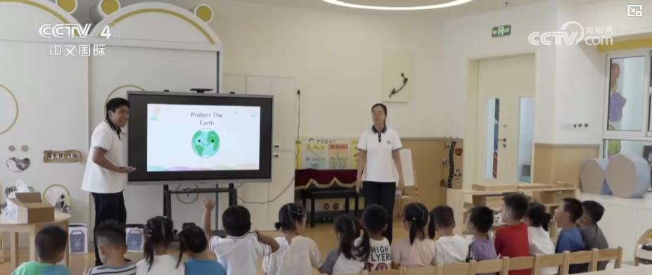 在雄安白塔幼兒園里,美國外教佩雷斯正在教孩子們?nèi)绾芜M行垃圾分類。