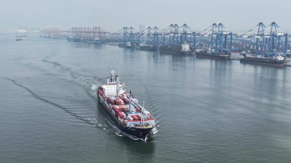 2024年9月14日,一艘滿載集裝箱的海輪駛離欽州港碼頭(無人機(jī)照片)。新華社記者 張愛林 攝