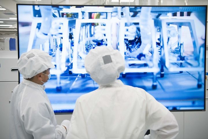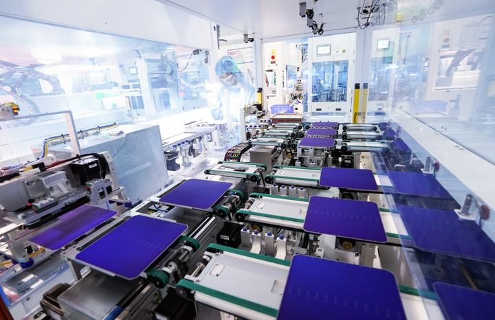 安徽合肥,全球單體產(chǎn)能最大的異質(zhì)結(jié)光伏電池及組件一體化工廠,工業(yè)機(jī)器人將一個(gè)個(gè)硅片投送到一架白色機(jī)器的腔體,經(jīng)過(guò)綿延的智能化流水線,狀如手機(jī)大小、薄如紙片的光伏電池片便下線了。