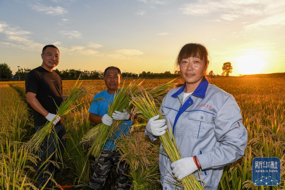 9月20日,在位于吉林省永吉縣萬(wàn)昌鎮(zhèn)的永吉縣禾谷豐水稻種植農(nóng)民專業(yè)合作社,負(fù)責(zé)人張帥(左一)和兩位農(nóng)民手捧收獲的水稻。