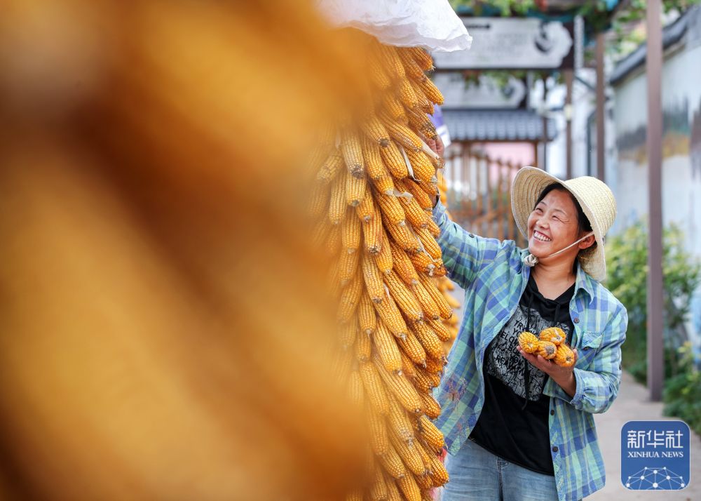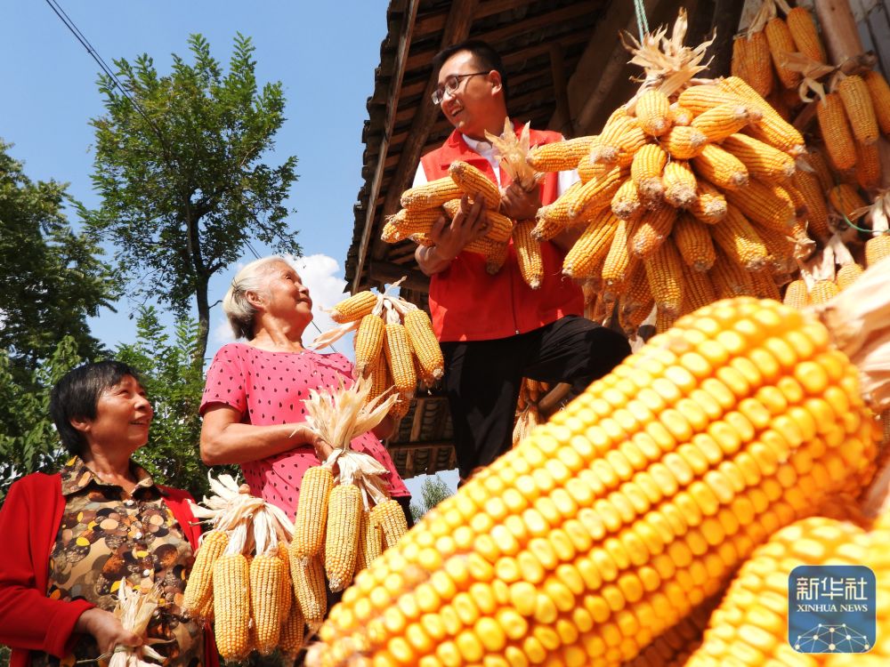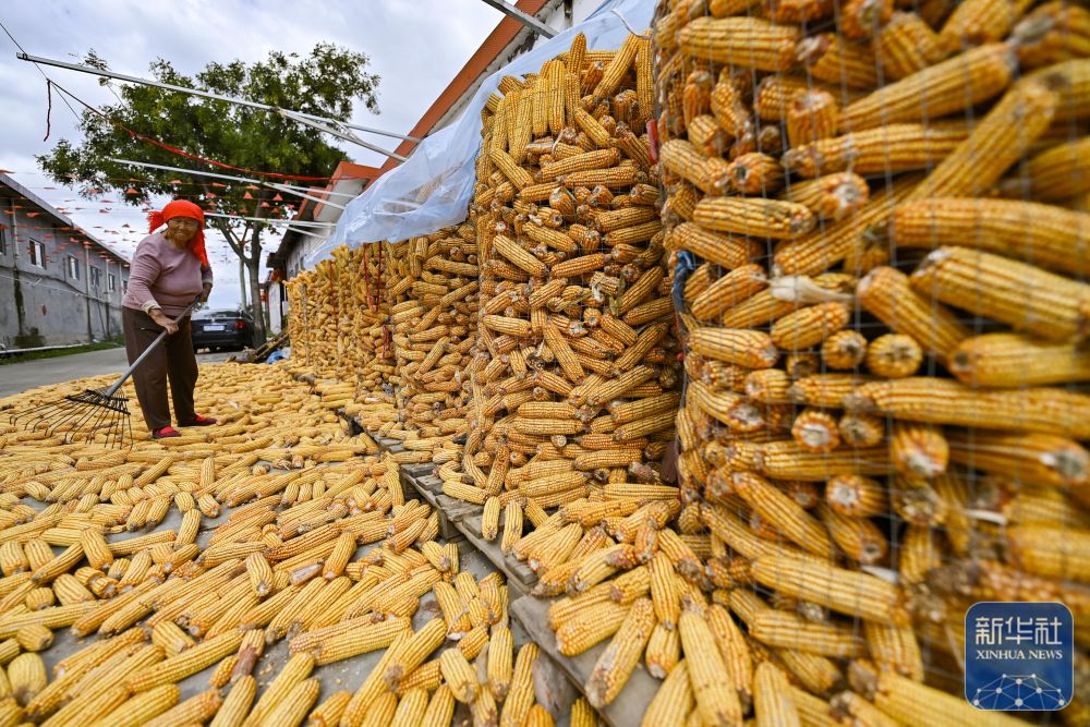 9月22日,在四川省達(dá)州市大竹縣朝陽(yáng)鄉(xiāng)木魚村,駐村工作隊(duì)員和村民在晾曬收獲的玉米。