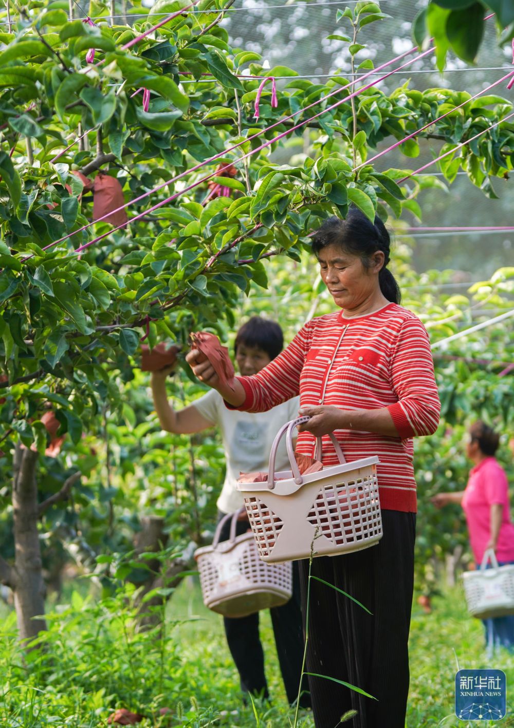 9月19日,在山東省鄒平市臺(tái)子鎮(zhèn)惠明農(nóng)場(chǎng),果農(nóng)在采摘新華梨。