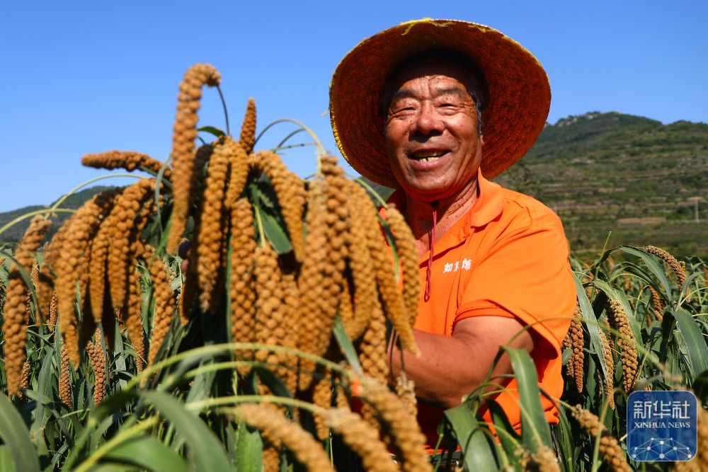 9月22日,山東省棗莊市山亭區(qū)農(nóng)民張令朋高興地展示收獲的谷穗。