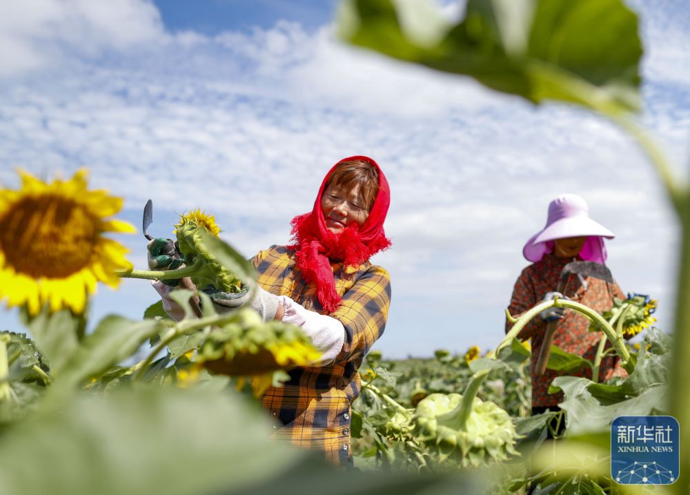 9月22日,在江蘇省鹽城市大豐區(qū)萬(wàn)盈鎮(zhèn)萬(wàn)豐綠茵現(xiàn)代農(nóng)業(yè)園區(qū),農(nóng)民在采收向日葵。