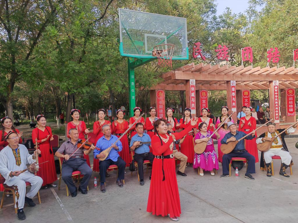 9月19日,庫爾勒市朝陽街道團(tuán)結(jié)社區(qū)“石榴籽藝術(shù)團(tuán)”正在為居民們表演。新華社記者顧煜 攝