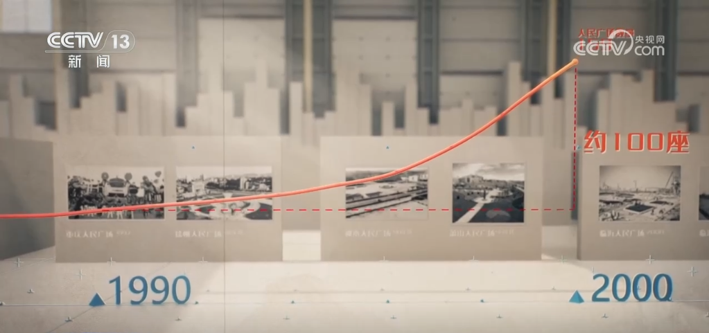 追溯歷史,將人民廣場(chǎng)的建設(shè)與時(shí)間線(xiàn)關(guān)聯(lián),我們發(fā)現(xiàn)了全國(guó)人民廣場(chǎng)建設(shè)的兩個(gè)重要時(shí)間節(jié)點(diǎn):在90年代,隨著城鎮(zhèn)化的步伐,更多的廣場(chǎng)滿(mǎn)足了人們對(duì)公共空間的新需求,大約有100座人民廣場(chǎng)在這十年間建成。2013年左右,一股新的建設(shè)浪潮出現(xiàn)在小型縣城,尤其是在剛剛擺脫貧困的地區(qū)興起,人民廣場(chǎng)的增量又與脫貧攻堅(jiān)的進(jìn)程同步見(jiàn)證了一塊塊土地從貧瘠到繁榮的動(dòng)人變遷。