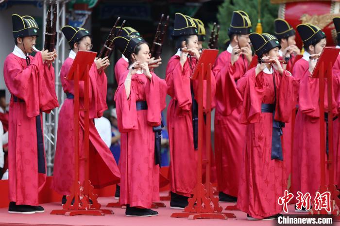 9月28日,臺北市各界紀念大成至圣先師孔子誕辰釋奠典禮在臺北孔廟舉行。圖為樂生在演奏中。中新社記者 陳小愿 攝