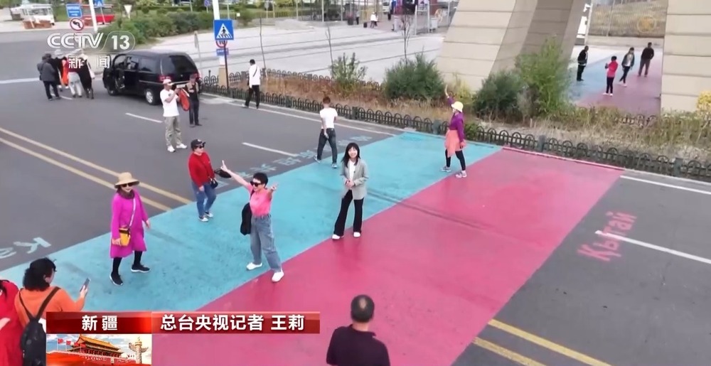 總臺(tái)央視記者 王莉:進(jìn)入合作中心,中哈連接通道處的“一步跨兩國(guó)”,絕對(duì)是游客的打卡首選地。紅色和藍(lán)色交界的地方,就是國(guó)界線(xiàn)了,線(xiàn)的一側(cè)紅色區(qū)域代表中國(guó),藍(lán)色區(qū)域代表哈薩克斯坦。前一秒還在中國(guó),只要一腳邁過(guò)分界線(xiàn),就能一秒“出國(guó)”,來(lái)到哈薩克斯坦。