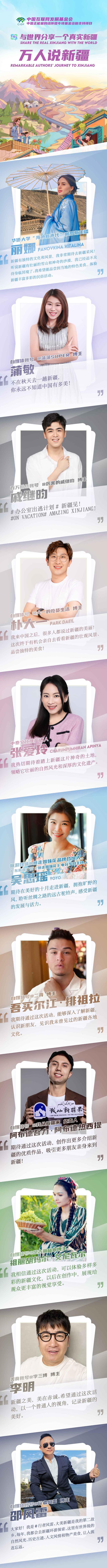 #萬人說新疆# 優(yōu)秀作者新疆行活動(dòng)將于10月8日在大美新疆開啟,五湖四海的“萬人說新疆”短視頻大賽獲獎(jiǎng)作者代表、中央和新疆新聞網(wǎng)站采編骨干、中外網(wǎng)絡(luò)達(dá)人等將齊聚新疆,講述真實(shí)新疆的故事。來自俄羅斯、韓國、泰國等多個(gè)國家的網(wǎng)絡(luò)達(dá)人對(duì)此行充滿期待,一起來聽聽他們的心聲……#大V說大美新疆# #大美新疆尋寶記#