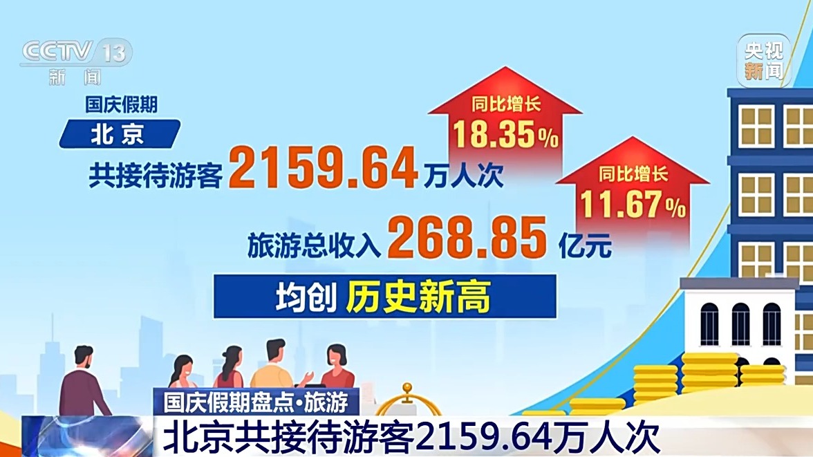 統計數據顯示,國慶假期,北京共接待游客2159.64萬人次,同比增長18.35%;旅游總收入268.85億元,同比增長11.67%,均創(chuàng)歷史新高。文博游、北京中軸線游、京郊游、微度假游、體育賽事游、特色商圈文化街區(qū)游、花燈游、網紅潮玩打卡地游等受到游客青睞。