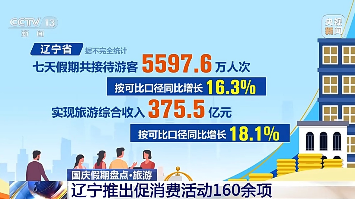 遼寧省據不完全統計,七天假期共接待游客5597.6萬人次,按可比口徑同比增長16.3%,實現旅游綜合收入375.5億元,按可比口徑同比增長18.1%。假期里遼寧省推出促消費活動160余項,全省各地舉辦文化藝術、群眾文化、非遺、文博等各類活動600余場,通過線上線下聯動的方式,豐富人們假日文化生活。